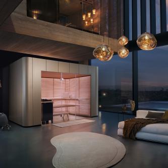 Um diesem Anspruch gerecht zu werden und Ideen in die Realität umzusetzen, hat sich KLAFS gemeinsam mit dem Studio F. A. Porsche intensiv der Form und Funktion von Saunen gewidmet und alles bislang Bekannte hinterfragt. Entstanden ist eine durchdachte und vollkommen neue Art der Saunakabine, die den Badenden auf eine Sinnesreise zwischen Wärme, Licht, Farbe und Klang mitnimmt. Diese natürlichen Reize, die den Körper fein dosiert positiv stimulieren, verbinden sich bei der Sauna S11 zu einem ganzheitlichen, wohltuenden und vielleicht sogar magischen Moment.